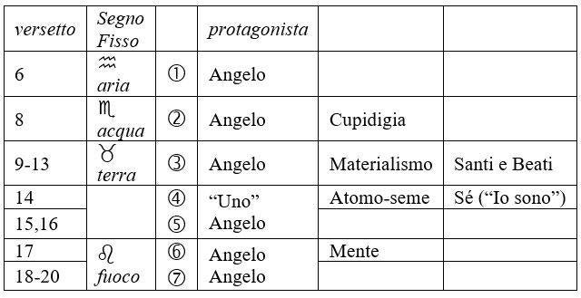 Troviamo descritti 7 protagonisti, fra i quali ci sono 6 angeli e “uno simile a Figlio d’uomo”. Se li guardiamo con uno sguardo d’assieme, essi rappresentano il percorso dell’evoluzione dello spirito dell’uomo, che diventa consapevole, diventa un “Io sono”, al quarto (come è corretto che sia) protagonista: l’“Uno”.