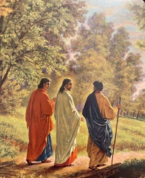 Nel medesimo giorno in cui Gesù apparve a Tommaso facendogli toccare le sue piaghe, due discepoli stavano camminando verso un villaggio nei dintorni di Gerusalemme. Durante il tragitto parlavano tristemente tra loro di quanto era accaduto, e ad un certo punto un’altra persona si avvicinò, chiedendo di che cosa stessero discutendo. Risposero che forse era straniero, perché non conosceva i fatti che avevano visto Gesù processato e crocifisso, che speravano che fosse lui a liberare Israele, ma dopo tre giorni ancora non ne avevano notizie. Gesù allora – perché era Lui che si era aggiunto – cominciò a spiegare le Scritture nei passaggi che si riferivano alla sua missione. Essi però non lo riconoscevano. Una volta giunti a destinazione, fece per allontanarsi, ma i due erano stati talmente affascinati dalle sue parole e dal suo modo di parlare, che lo invitarono a unirsi a loro.