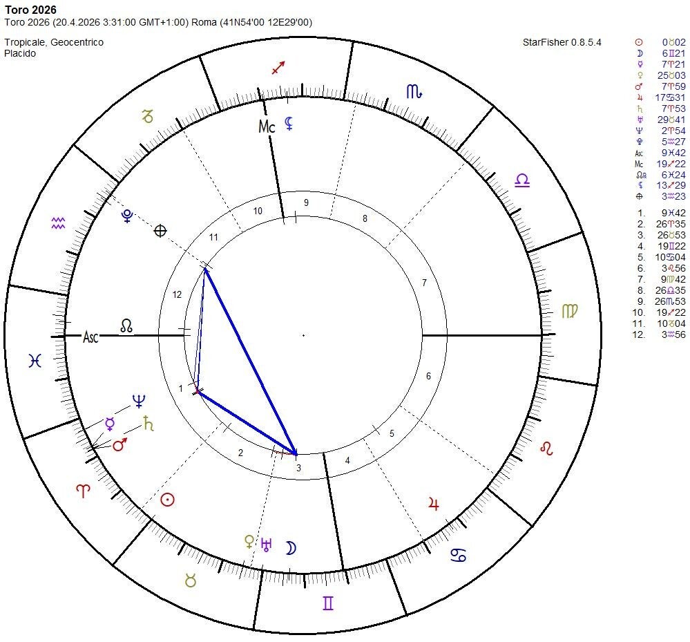 La mia riflessione personale riguarda la presenza di ben quattro pianeti nel bellicoso segno dell’Ariete, dove troviamo Marte, Saturno, Mercurio e Nettuno. Pianeti che qui, a mio avviso, rappresentano i “semi” che si dovranno sviluppare in frutti più o meno “buoni”!